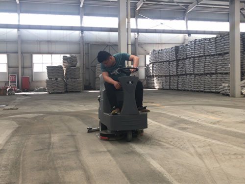 駕駛式洗地機(jī)在倉(cāng)庫(kù)水泥地面上使用